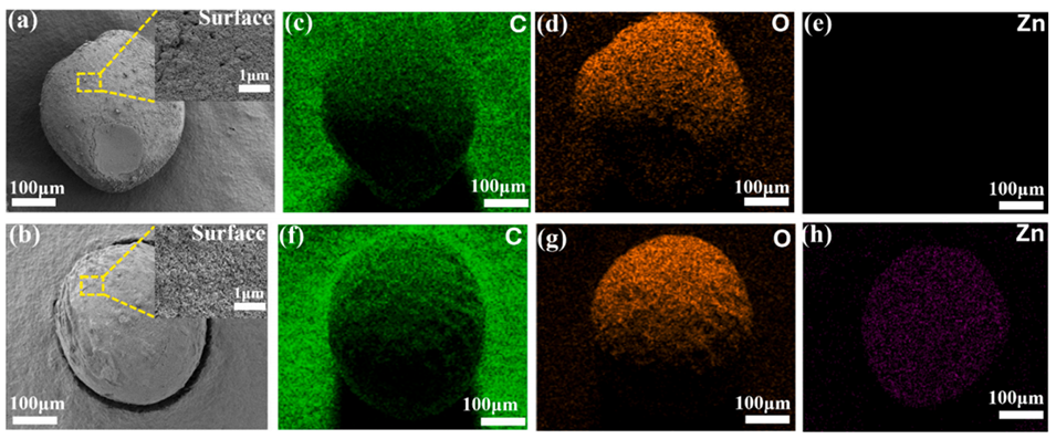 图3.(a)SP微凝胶和(b)SPZ微凝胶的SEM图像。(c-e)SP微凝胶和(f-h)SPZ微凝胶的EDS分析。