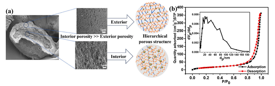 图2.(a)断裂SPZ微凝胶内部的SEM图像和(b)SPZ微胶的BET分析。