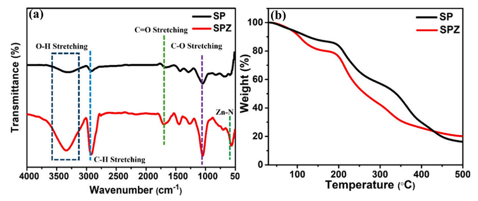 图4.(a)SP和SPZ微凝胶的FTIR和(b)TGA分析。