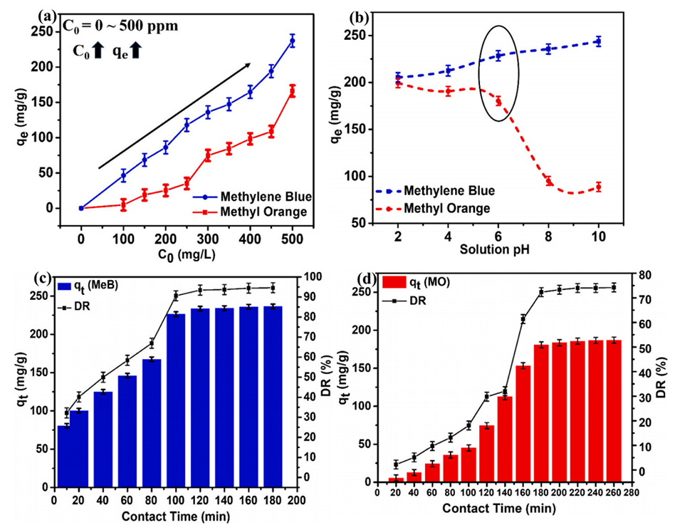 图7.(a)MeB和MO的初始浓度对SPZ微凝胶吸附容量的影响(初始染料浓度=100-500mg/L,溶液pH=6,吸附剂剂量=0.02g,染料体积=10mL,室温,接触时间=180min)。在不同接触时间下,(c)MeB和(d)MO在SPZ微凝胶上的染料吸收率(qt)和染料去除率(DR)(初始染料浓度=500mg/L,溶液pH=6,吸附剂剂量=0.02g,染料体积=10mL,室温)。