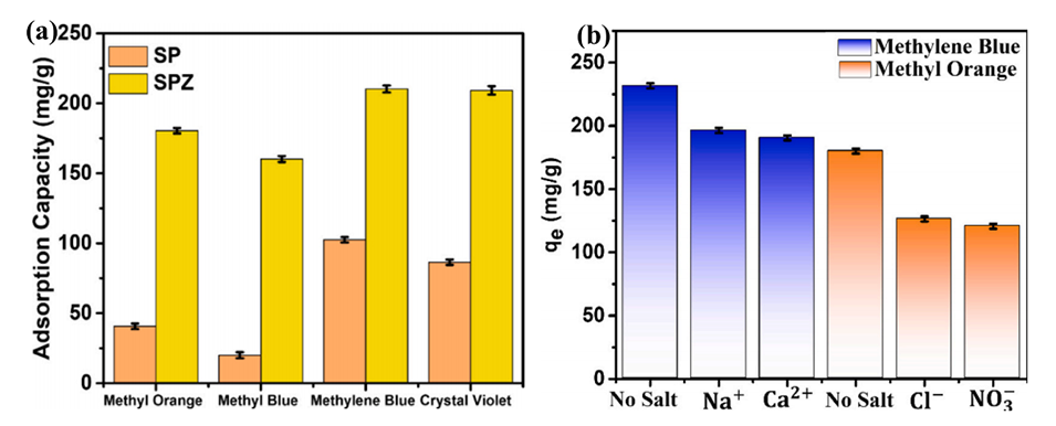图10.(a)SP和SPZ微凝胶的吸附性能比较以及(b)共存阴离子和阳离子对阴离子和阳离子染料的影响。