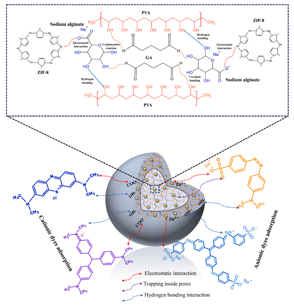 4、多样化的吸附机制:SPZ微凝胶的吸附机制包括静电吸引、氢键作用和物理捕获等。阳离子染料与微凝胶表面的负电荷功能团之间的强静电相互作用,以及阴离子染料与ZIF-8中暴露的正电荷位点之间的相互作用,均增强了吸附能力。