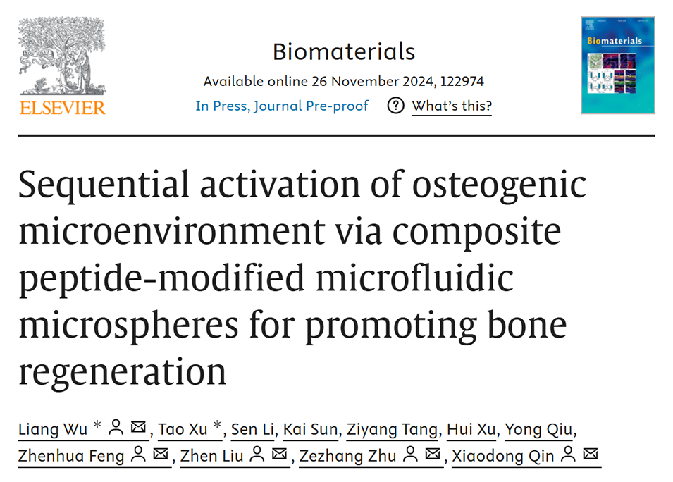成骨微环境(OME)显著影响骨修复,然而,再现其动态激活和修复过程仍然具有挑战性。近期,南京大学医学院附属鼓楼医院秦晓东教授、朱泽章教授、刘臻教授等人开发了一种复合肽修饰的微流控微球,通过序贯激活成骨微环境促进骨再生,为治疗难治性骨缺损提供了新策略。相关研究以“Sequential activation of osteogenic microenvironment via composite peptide-modified microfluidic microspheres for promoting bone regeneration”为题目,发表在期刊《Biomaterials》上。