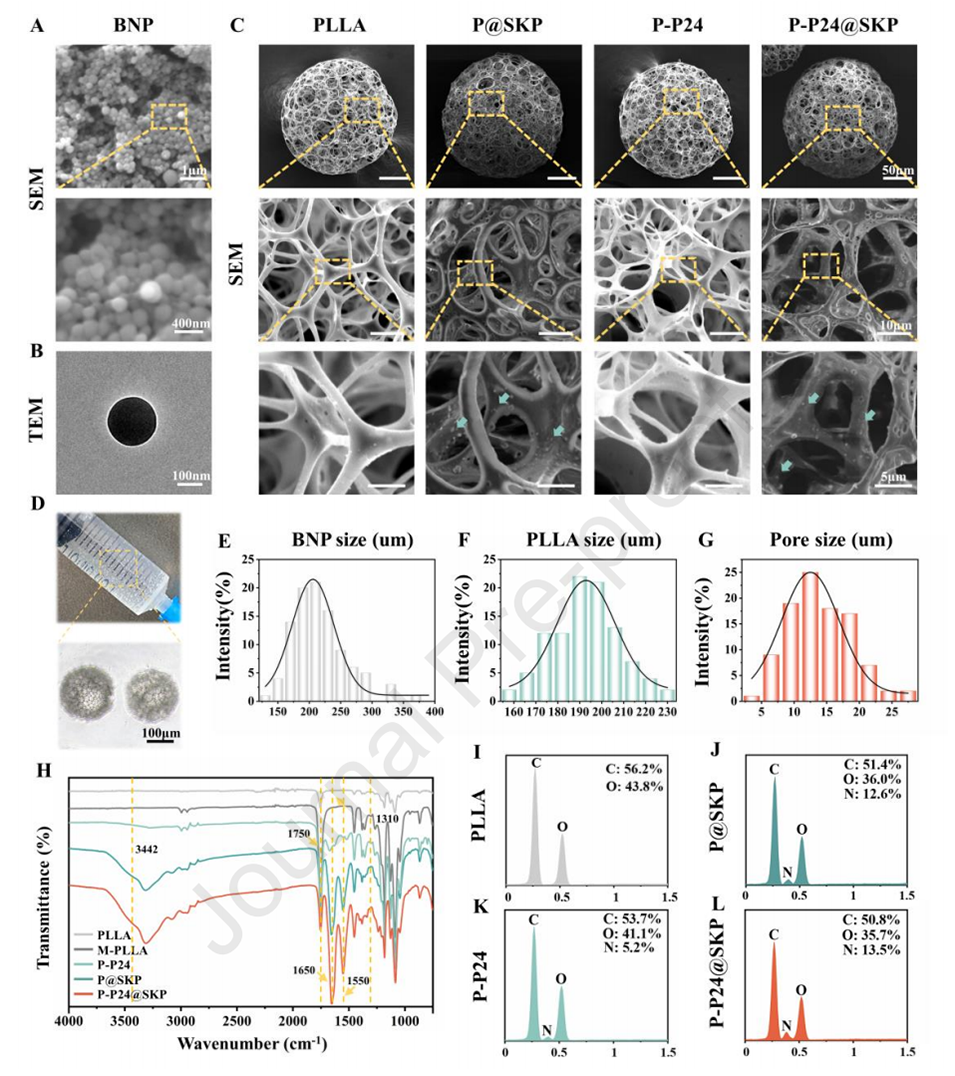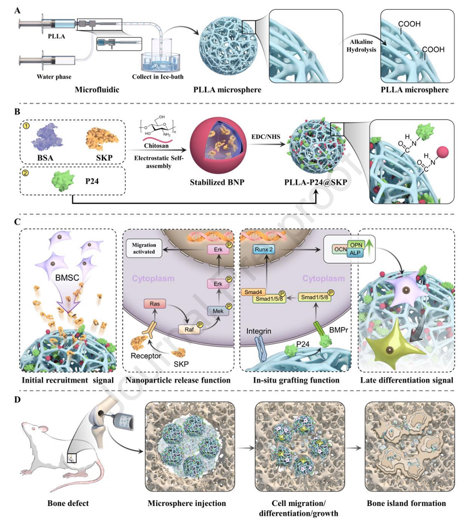 2、采用微流控技术制备的聚L-乳酸微球经表面改性,通过非均相接枝牛血清白蛋白纳米颗粒和干细胞趋化肽(BNP@SKP)以及BMP-2模拟肽(P24),实现了肽的初始释放和原位固定。