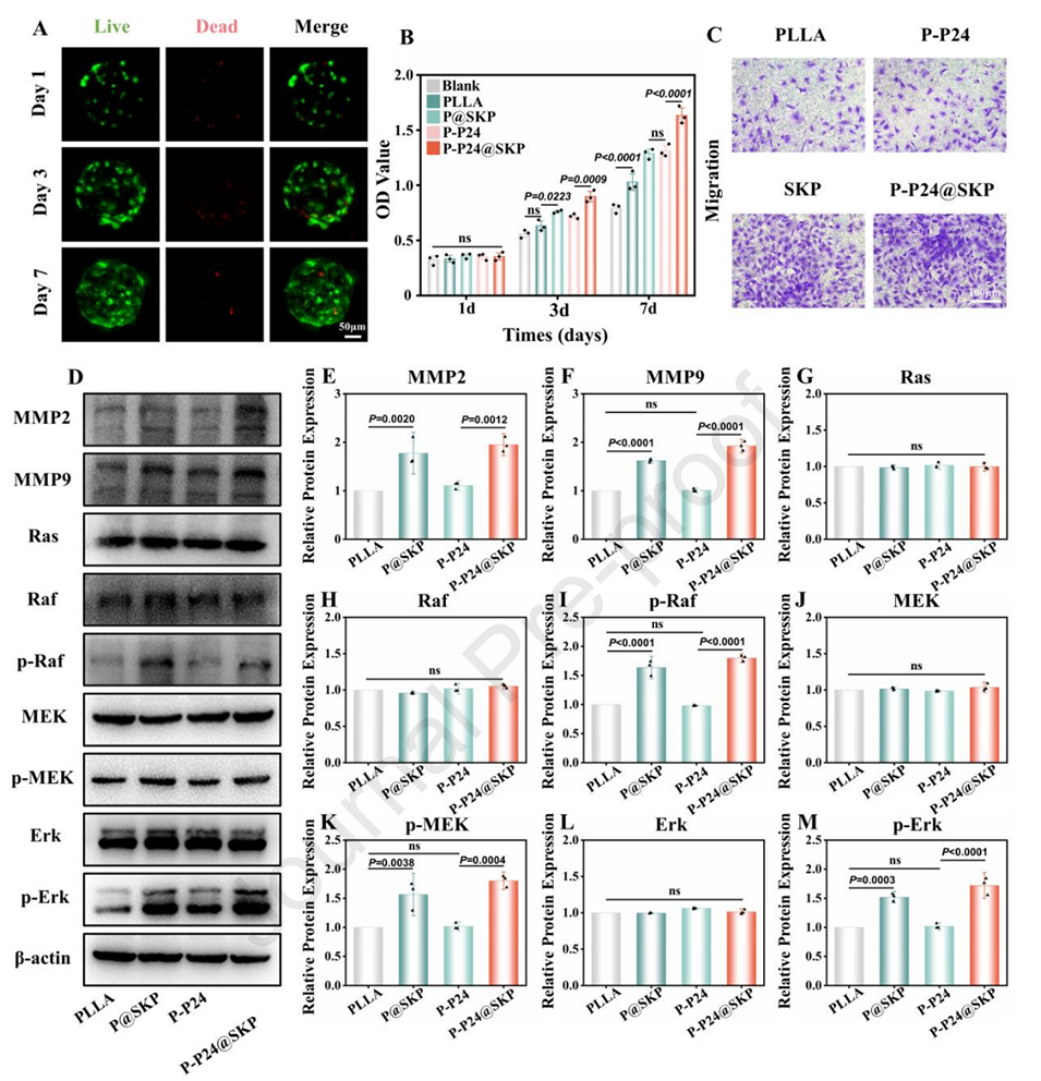 1、化学趋化:微球表面修饰的肽(如SKP和P24)能够有效吸引MSC到达骨损伤部位。实验表明,修饰微球的存在显著提高了MSC的迁移能力,尤其是在P-P24@SKP组中,MSC的迁移数量比对照组高出三倍。