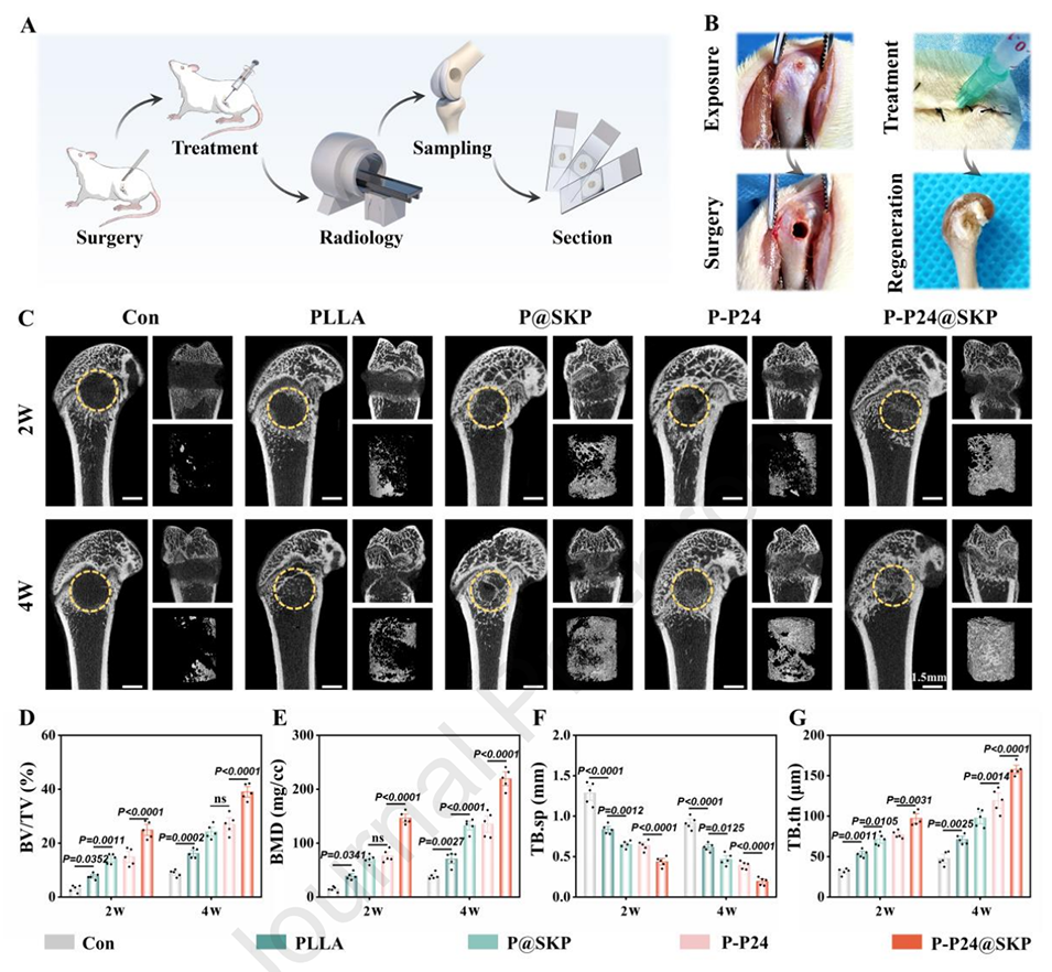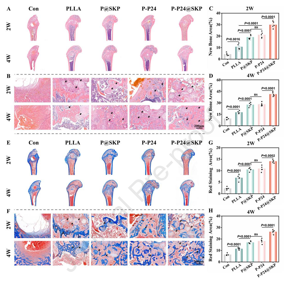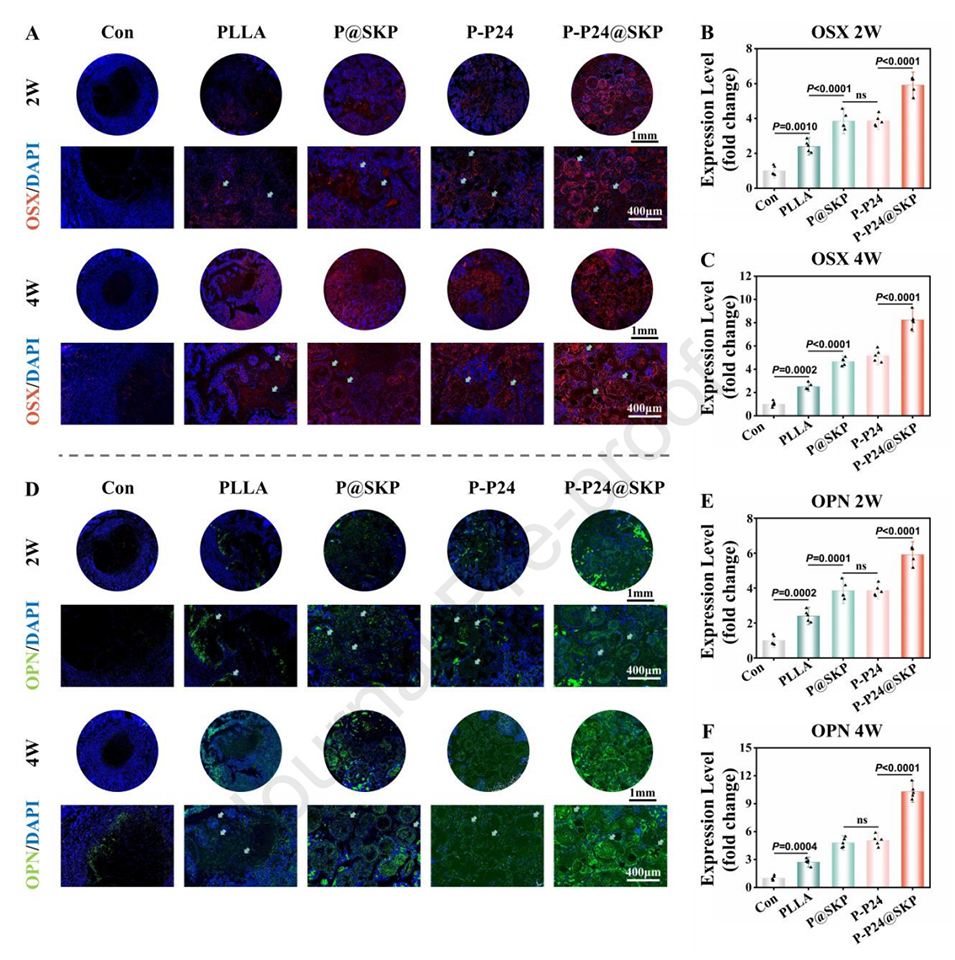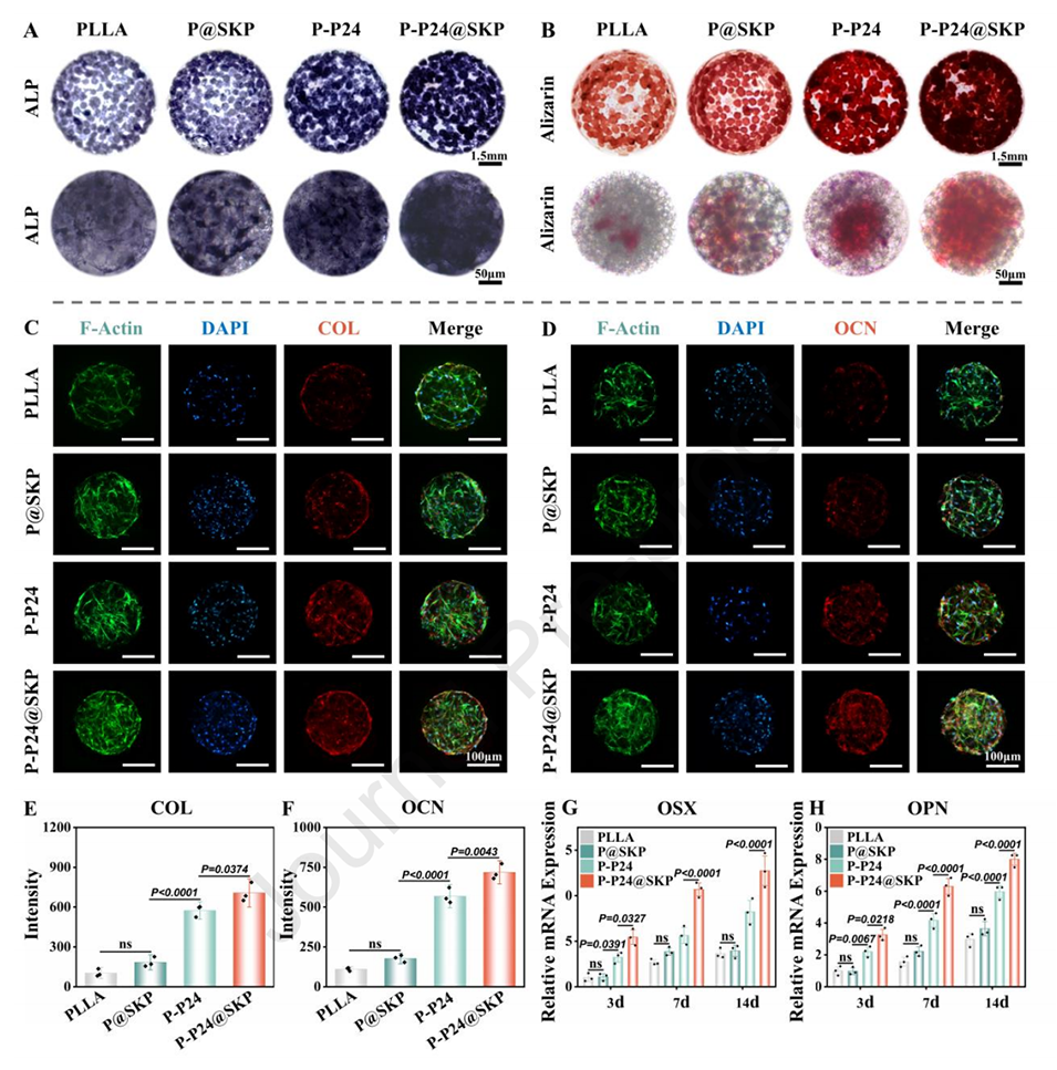 2、促进骨生成分化:微球通过释放BMP-2模仿肽(P24)和其他信号分子,激活MSC的骨生成分化。体外实验显示,MSC在P-P24@SKP微球上培养后,表现出更高的碱性磷酸酶(ALP)活性和矿化能力,表明其骨生成能力增强。