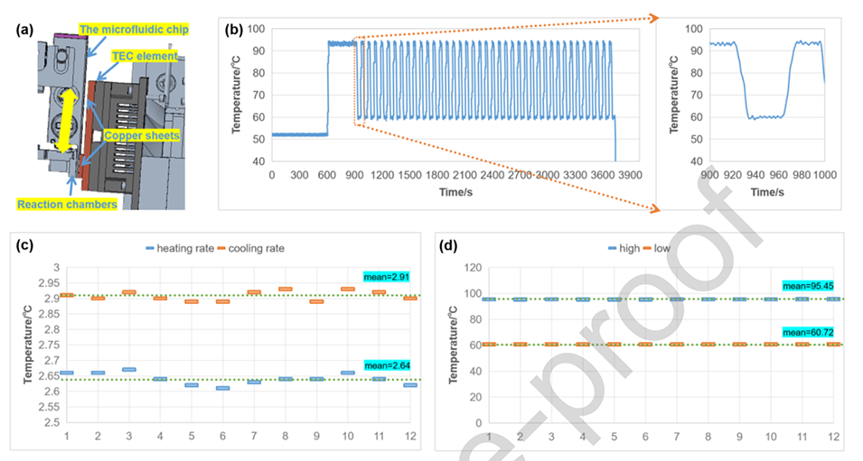 5、热循环模块:微流控芯片配备了微型热循环仪,能够提供精确的温度控制,以确保PCR反应的高效进行。系统的加热和冷却速率分别为2.64°C/s和2.91°C/s,温度波动范围保持在±0.1°C内,保证了PCR反应的稳定性和可靠性。