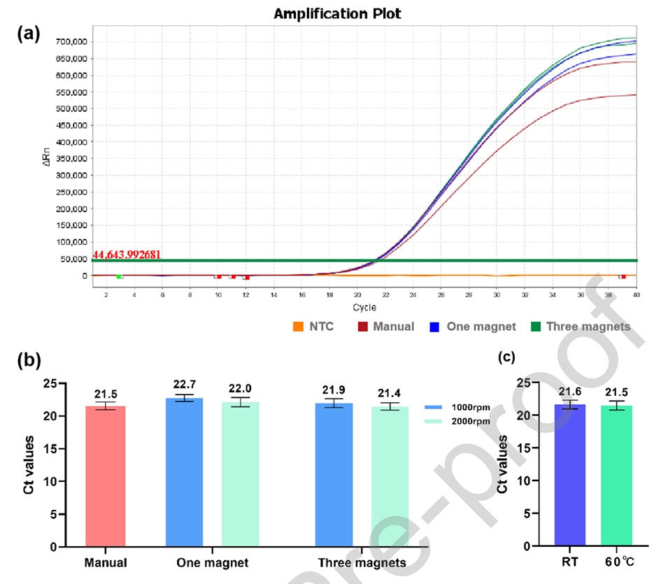 磁珠固相提取技术因其温和处理、低污染风险和高回收率成为自动化核酸提取的主流方法,但目前构建完全自动化的核酸检测系统仍面临技术挑战,如磁场和流体动力学的精确控制,以及样品制备与下游NA扩增之间的接口优化。因此,开发紧凑、集成化的核酸检测系统以获取快速、可靠的检测结果,具有重要的研究意义和应用前景。