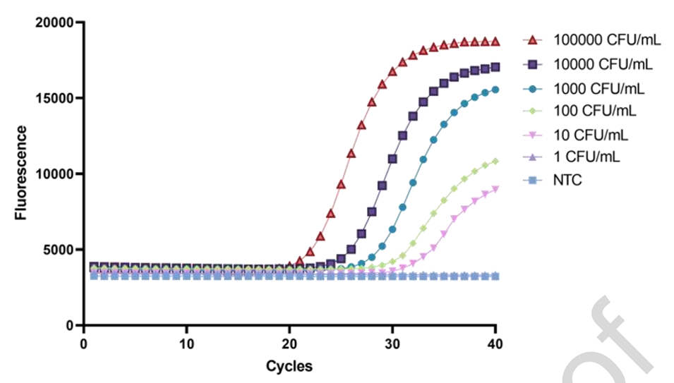 3、该系统配备12个反应室和一个四色荧光检测模块,可在80分钟内同时检测多达48个独特靶标,在加标样品中实现低至10 CFU/mL的检测灵敏度。