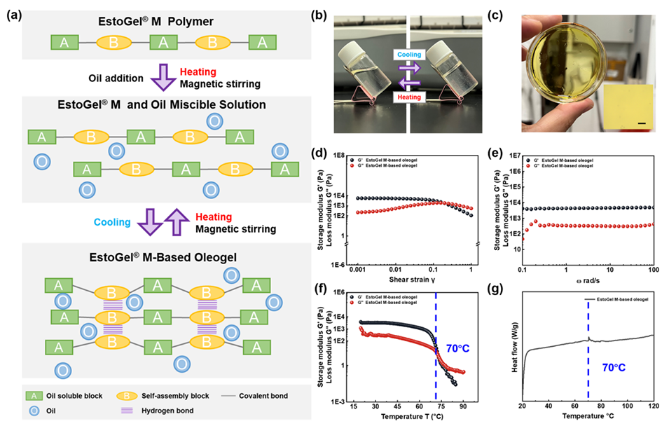 图2.(a)EstoGelM基油凝胶凝胶化机理示意图。(b)油凝胶状态随温度变化的图像。(c)含有辅酶Q10的EstoGelM基油凝胶图片。显微图像显示在右下角。(d)EstoGelM基油凝胶的振幅扫描。(e)EstoGelM基油凝胶的振荡频率扫描。(f)EstoGelM基油凝胶的振荡温度扫描,显示温度依赖的G′和G′′。(g)EstoGelM基油凝胶的DSC分析。比例尺为1mm。