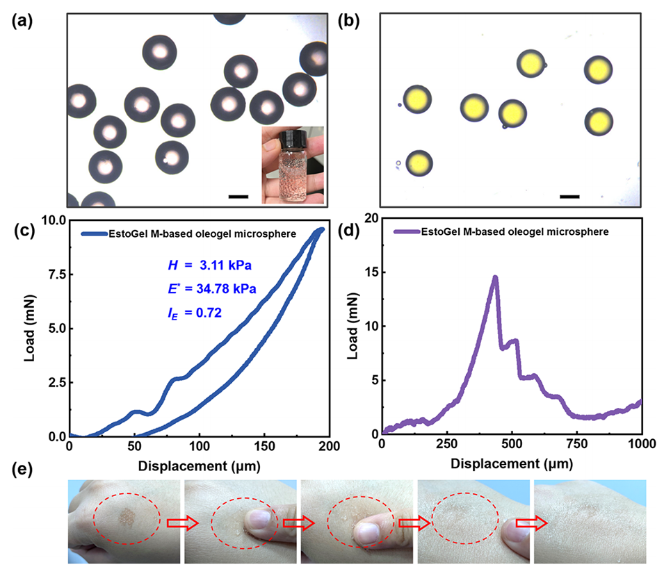 图4.(a)EstoGelM基油凝胶微球包裹疏水活性成分紫草油的显微图像。分散相和连续相的流速分别为20和60mL/h。比例尺为1mm。(b)包封疏水活性成分辅酶Q10的EstoGelM基油凝胶微球的显微图像。分散相和连续相的流速分别为6和30mL/h。比例尺为1mm。(c)包封疏水活性成分紫草油的EstoGelM基油凝胶微球的压痕顺应性曲线。(d)包封疏水活性成分紫草油的EstoGelM基油凝胶微球的渗透试验曲线。(e)EstoGelM基油凝胶微球包埋紫草油的使用步骤。