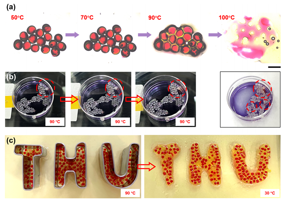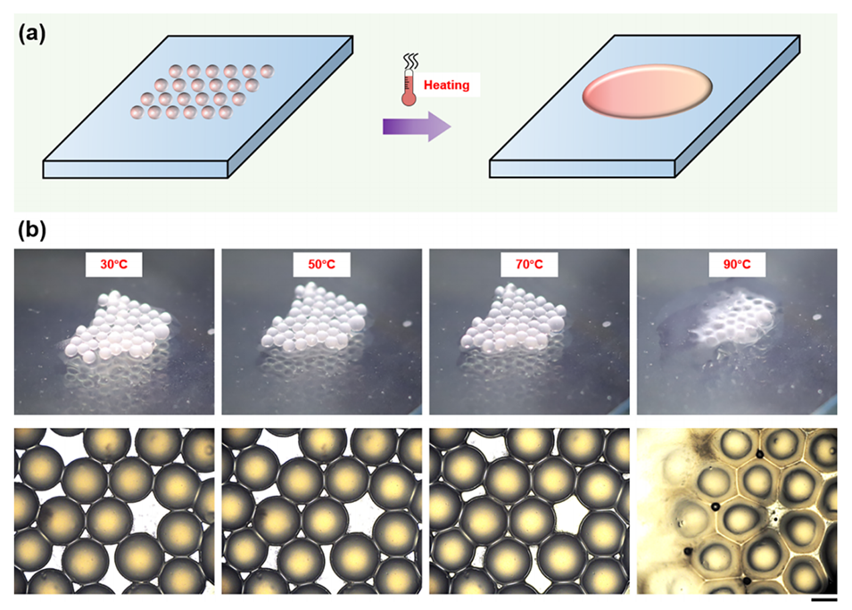 图5.(a)EstoGelM基油凝胶微球热稳定性评估示意图。(b)不同温度条件(30、50、70和90°C)下EstoGelM基油凝胶微球的照片和显微图像。比例尺为1mm。