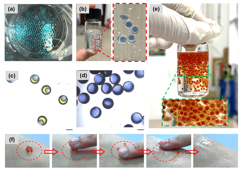图6.(a)EstoGelM基油凝胶微胶囊包裹亲水性可食用蓝色色素的图像。内相、中间相和外相流体的流速分别为5、12和200mL/h。(b)EstoGelM基油凝胶微胶囊包裹亲水性铜肽的图像。内相、中间相和外相流体的流速分别为10、40和200mL/h。(c)同时包封疏水性辅酶Q10和亲水性铜肽的EstoGelM基油凝胶微胶囊的显微图像。内相、中间相和外相流体的流速分别为5、12和100mL/h。比例尺为1mm。(d)同时包封疏水性紫草油和亲水性铜肽的EstoGelM基油凝胶微胶囊的显微图像。内相、中间相和外相流体的流速分别为5、12和100mL/h。比例尺为1mm。(e)同时包封疏水性辅酶Q10和亲水性VB12的EstoGelM基油凝胶微胶囊的图像。内相、中间相和外相流体的流速分别为3、10和80mL/h。(f)包封疏水性辅酶Q10和亲水性VB12的油凝胶微胶囊的使用步骤。