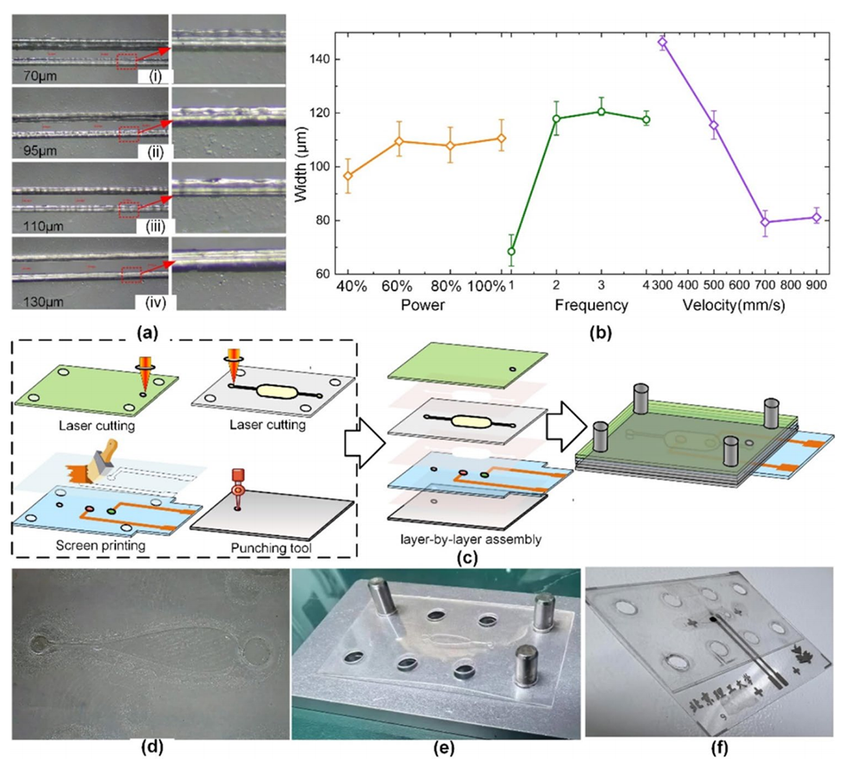 图2.微流控器件的制造:a不同宽度的微通道;b激光功率、扫描速度、重复次数对通道宽度的影响;c加工和粘接工艺示意图;d粘结的微流体层;e对齐夹具;f完整的微流体装置