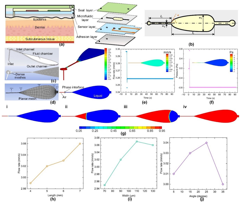 图1.a微流体器件的3D堆叠集成结构;b微流体层的几何形状和尺寸;c 3D模型以及3D模型中的网格和流速分布;d VOF模型和初始相界面。微流体仿真结果:e速度-时间曲线和速度分布;f压力-时间曲线和压力分布;g从入口到出口的微流体流动过程中的代表性力矩;h流速随通道长度的变化;i流速随通道宽度的变化;j流速随扩散角的变化