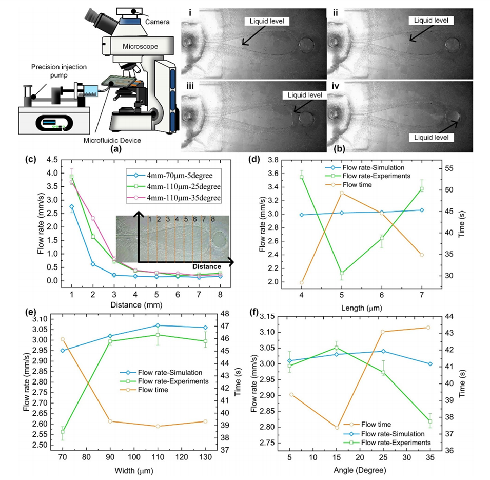 图3.微流体装置中的流动结构:a微流体装置中人工汗液的流动过程;b测量流速;c流动过程中流速的变化。实验设备和流动结果:d通道长度的影响;e通道宽度的影响;f扩散角的影响