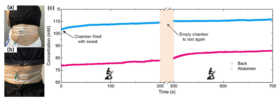 图5.受试者背部和腹部Na+的实时电位分析。在实时检测过程中,记录在汗液流过体腔后开始,持续200秒后停止。随后,将液室清空,重新开始检测。