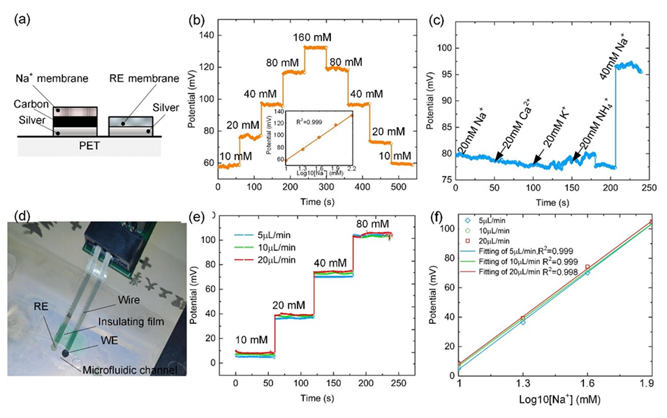 图4.a电极结构示意图;b测量Na+的开路电位(OCP)响应;c Na+选择性评估;d与微流体结构集成的电化学传感器;e不同人工汗液流速下Na+的OCP反应;f不同流速下Na+的校准曲线