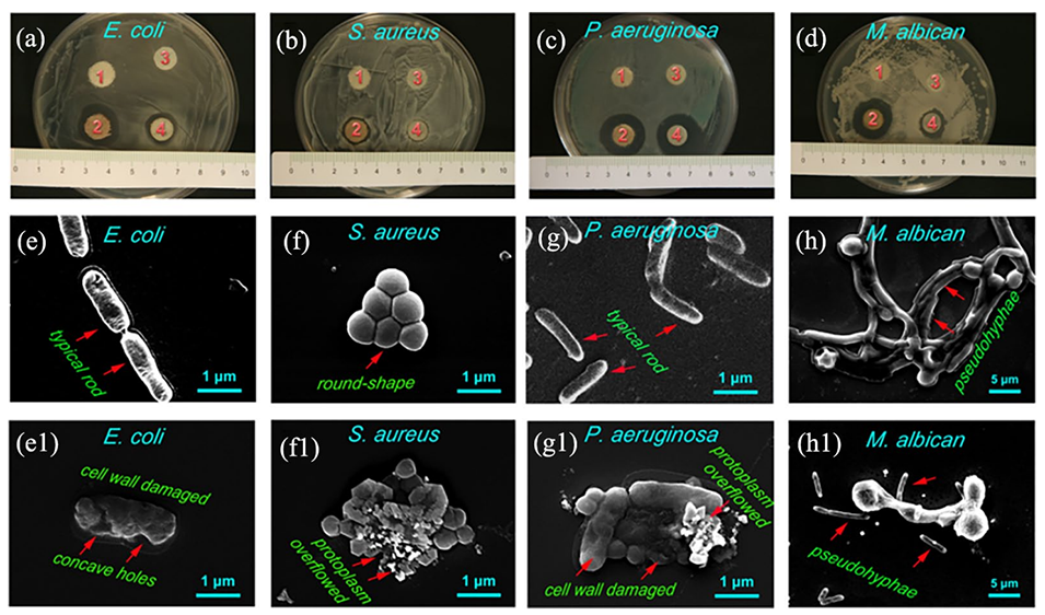 图2.(a–d)对大肠杆菌(a)、金黄色葡萄球菌(b)、铜绿假单胞菌(c)和白色念珠菌(d)的抗菌活性。(e–h)大肠杆菌(e)、金黄色葡萄球菌(f)、铜绿假单胞菌(g)和白色念珠菌(h)的扫描电镜图像。(e1–h1)用纱布-NS(1)、纱布-Ag(2)、纱布-SA-SF(3)和纱布-SA-SF-Ag(4)处理后的大肠杆菌(e1)、金黄色葡萄球菌(f1)、铜绿假单胞菌(g1)和白色念珠菌(h1)的SEM图像。
