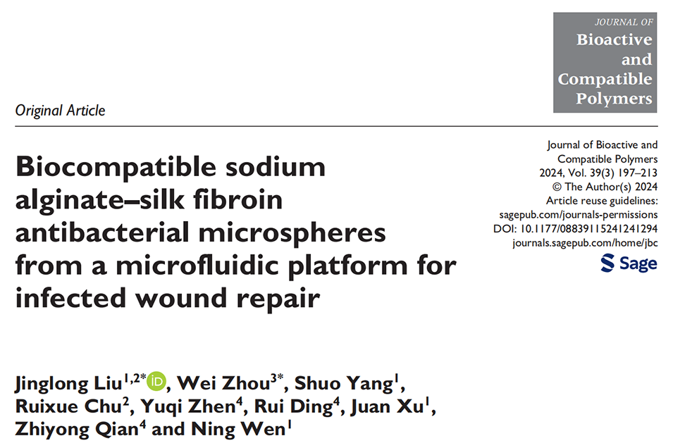近期,中国人民解放军总医院温宁教授、徐娟副教授、Jinglong Liu等人与北大口腔医院周维和内蒙古医科大学钱智勇团队合作,通过引入丝素蛋白(SF)包覆AgNPs,开发了一种基于微流控芯片的抗菌复合微球(SA-SF-Ag),用于感染性创面修复。相关研究以“Biocompatible sodium alginate–silk fibroin antibacterial microspheres from a microfluidic platform for infected wound repair”为题目,发表在期刊《Journal of Bioactive and Compatible Polymers》上。