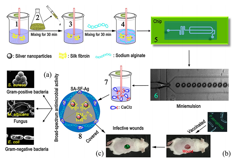 Scheme1.使用微流控芯片技术合成SA-SF-Ag的示意图(1-8)。(a)SA-SF-Ag的广谱抗菌活性。(b)感染小鼠皮肤伤口模型。(c)SA-SF-Ag对感染伤口的治疗效果。