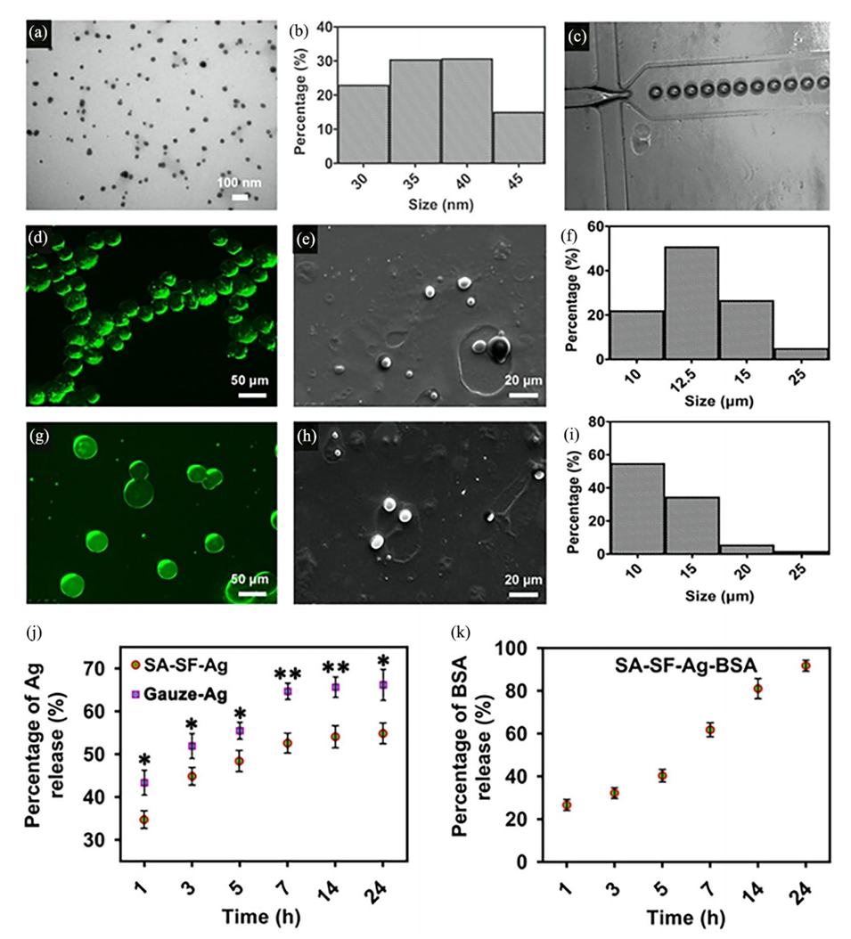 图1.AgNPs、SA-SF微滴和SA-SF-Ag微球的表征。