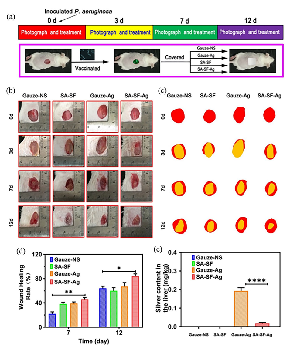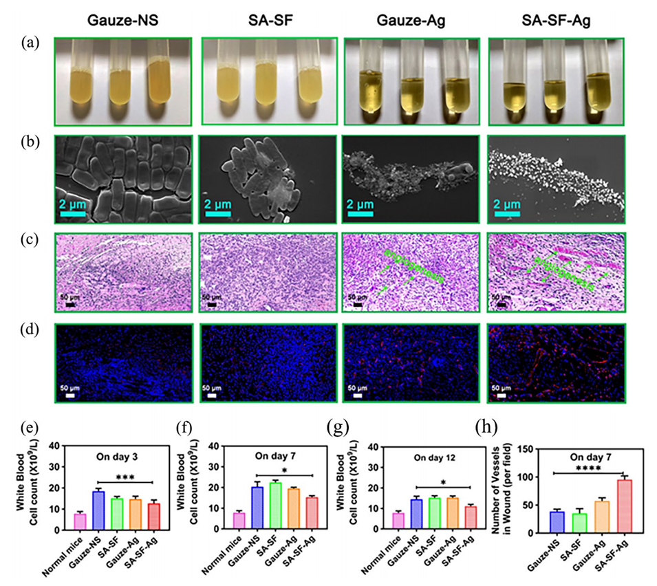 4、体内结果表明,SA-SF-Ag通过杀死小鼠模型感染皮肤伤口表面的铜绿假单胞菌,促进感染伤口愈合和血管生成。