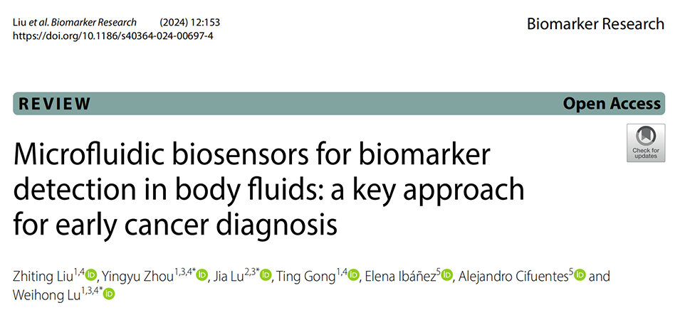 近期,哈尔滨工业大学卢卫红教授、周英钰副教授等人发表综述,总结了2018至2024年微流控生物传感器在早期癌症诊断方面的最新进展,包括其工作原理、制造技术以及与纳米技术的结合应用,重点讨论了新型检测技术、纳米材料和微流控芯片结构的创新,以及它们在早期癌症诊断和个性化医疗中的潜在应用。相关研究内容以“Microfluidic biosensors for biomarker detection in body fluids: a key approach for early cancer diagnosis”为题目,发表在期刊《Biomarker Research》上。