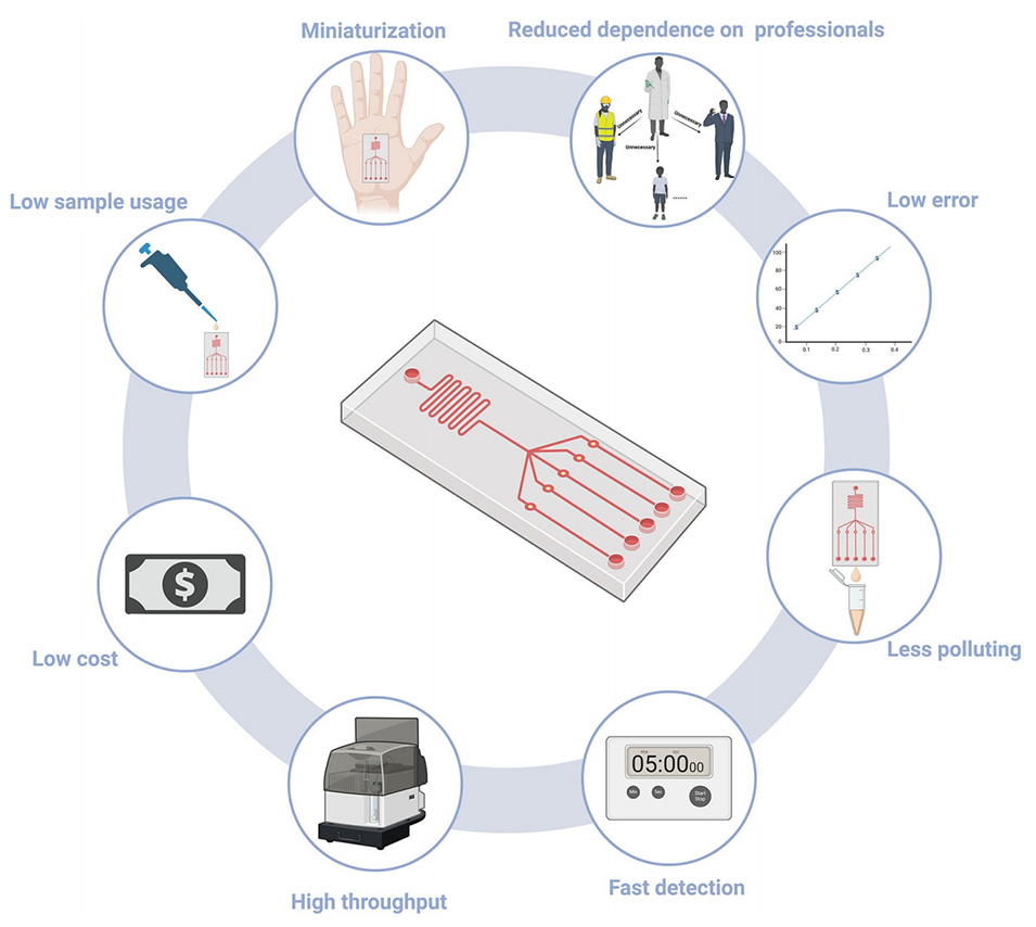 图1.微流体生物传感器的优点包括低误差、低样品使用量、小型化、减少对专业人员的依赖、污染少、检测速度快、吞吐量高、成本低。