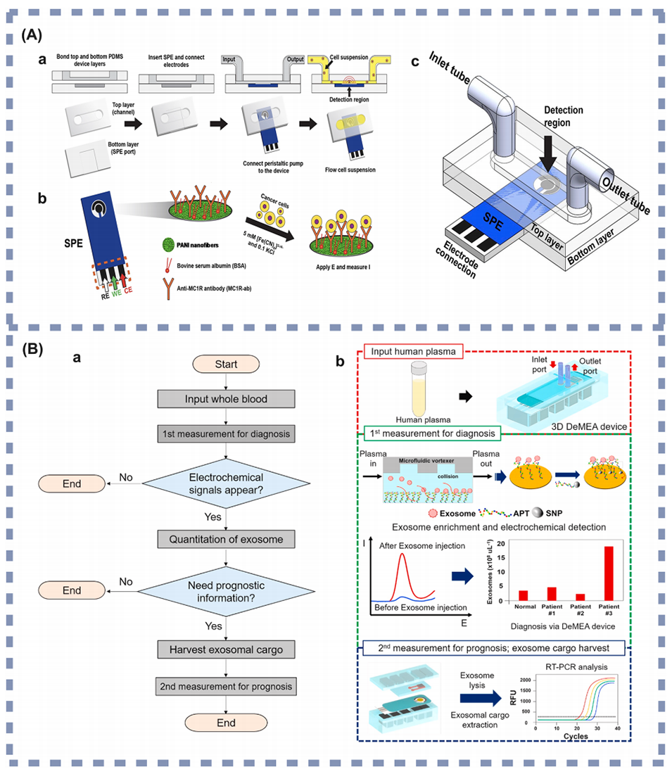 图3.(A)基于电化学免疫传感器的微流体设备组件和装配顺序,以及用于黑色素瘤细胞检测的MC1R-Ab-PANI/SPE电化学免疫测定方案。(B)基于电化学适配体传感器的微流控设备的工作原理图和完整分析系统示意图。