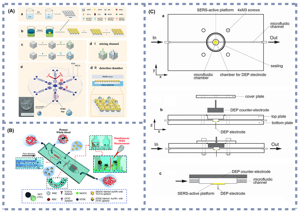 图4.(A)使用基于Au@SiO2阵列的高活性SERS基板的微流体装置。(B)基于SERS适配体的微流控芯片用于肝细胞癌CTC捕获、SERS测量和单细胞表型分析的工作流程。(C)用于在SERS平台表面介电泳沉积CTC的微流控芯片示意图。