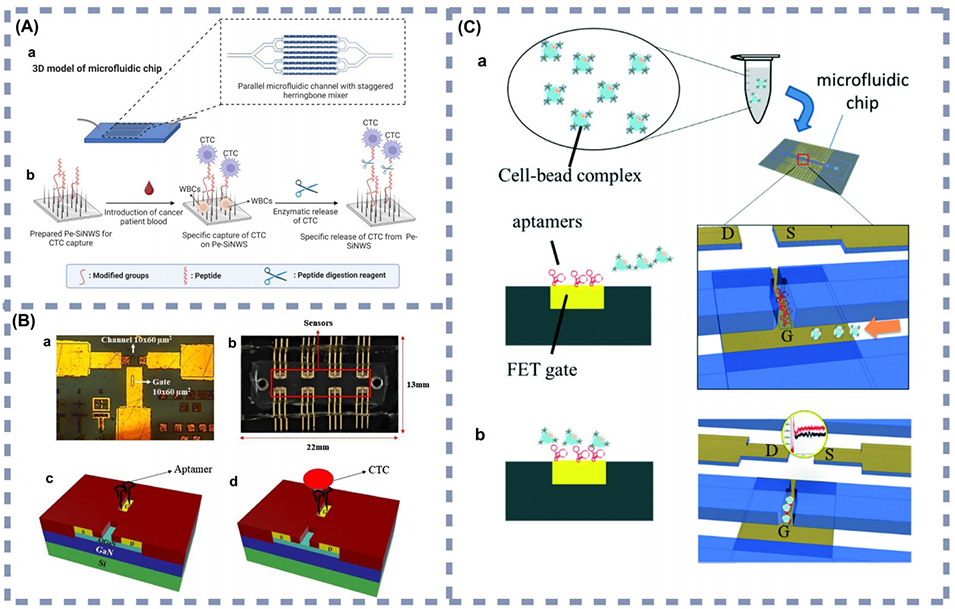 图6.(A)与肽功能化硅纳米线结合的微流体装置。(B)基于AlGaN/GaN HEMT阵列的微流体器件。(C)CTC捕获和检测过程的示意图。