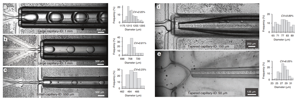 2、毛细管的锥形设计:为了进一步增强尺寸调节能力,研究者对550μm内径的毛细管进行了锥形处理,形成了150μm和50μm的尖端,从而生成了更小的薄壳双乳液。