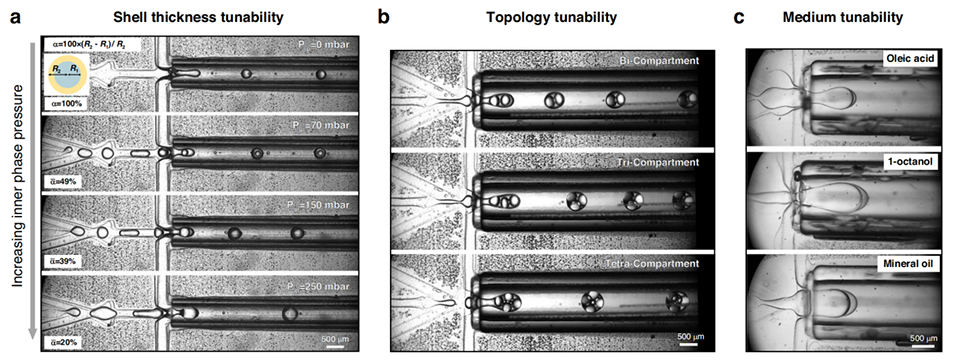 图4.展示了PDMS玻璃毛细管装置的可调性,包括通过内相压力控制双乳液的壳厚度、形成含有2到4个水相核心的多室双乳液、使用不同的中间相(油相)形成薄壳双乳液。