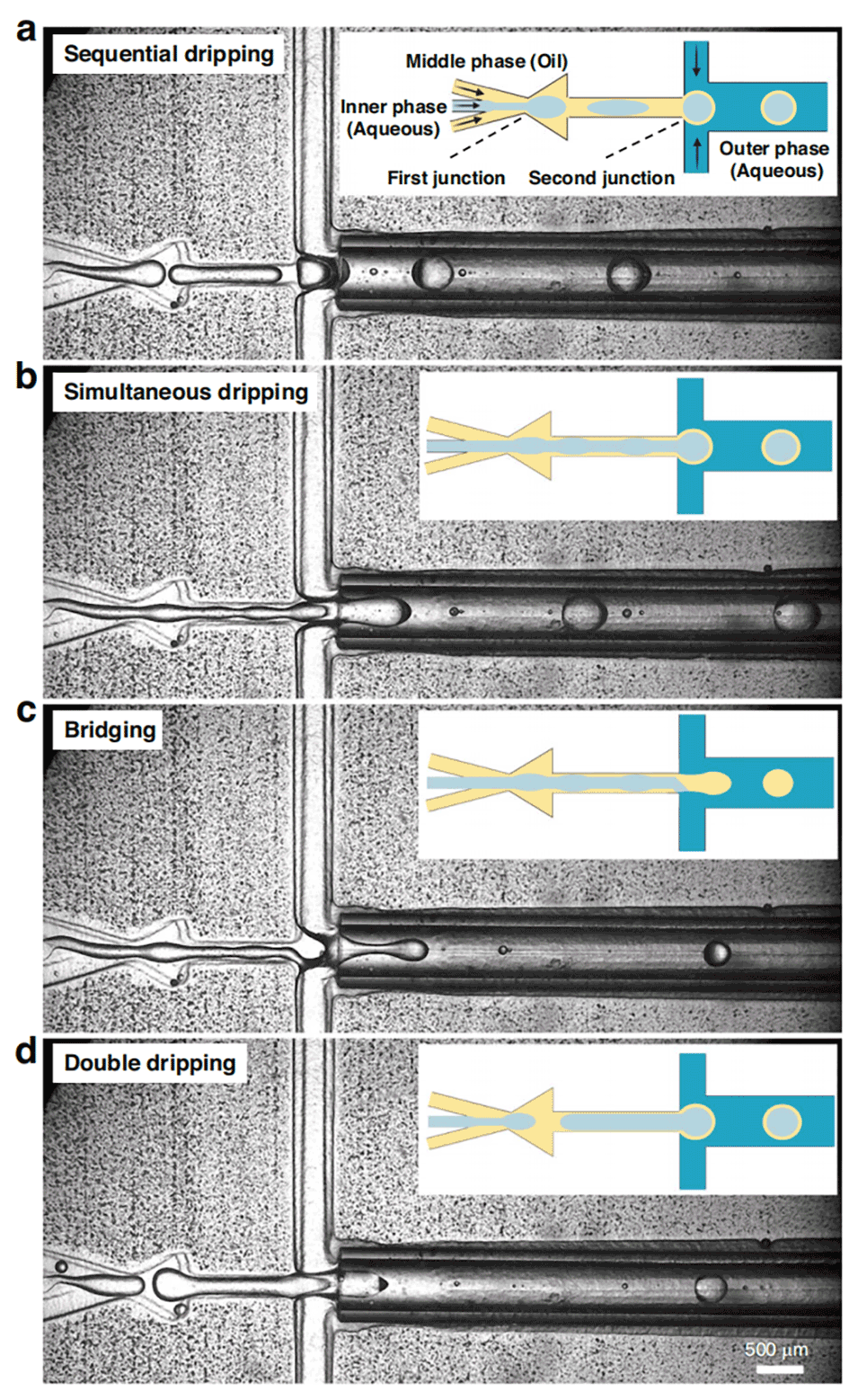 图5.展示了不同的薄壳双乳液形成模式,包括顺序滴落、同时滴落、桥接现象和双滴落模式。在示意图中,不同的相位由不同的颜色表示。浅蓝色(IP)、黄色(MP)和深蓝色(OP)。