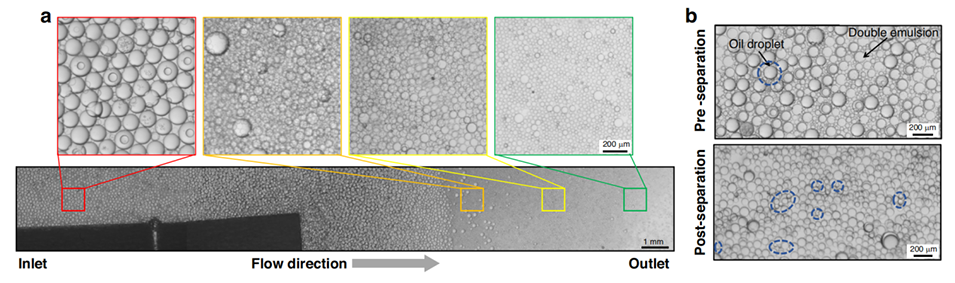 图7.分离芯片成功从油滴中分离出双乳液。包括分离芯片中油滴和双乳液分布的图像,以及分离前后样品的比较,展示了该分离方法的有效性。