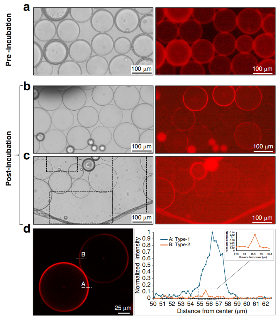 图8.通过溶剂提取法由双乳液模板形成巨型脂质体的过程。包括双乳液和形成的两种不同类型脂质体的亮场和荧光显微镜图像,脂质体的共聚焦图像及其相应的膜荧光强度剖面。