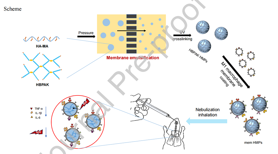 Scheme 1.吸入巨噬细胞膜包被的ROS清除水凝胶微粒(HMPs)用于体内治疗急性肺损伤(ALI)。HBPAK HMPs是通过使用膜乳化机的W/O乳化法制备的,然后在紫外线照射下交联HAMA和HBPAK。随后,HBPAK HMPs被M1型巨噬细胞膜包裹,通过雾化吸入的方式给予ALI小鼠。