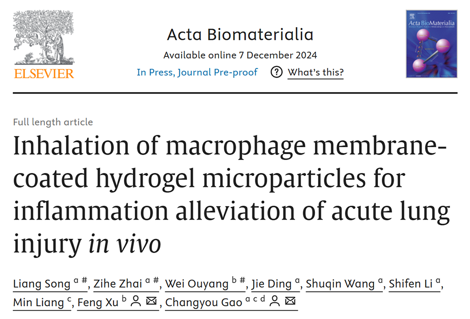 近期,浙大高分子系高长有教授和浙大二院感染科徐峰教授合作,研发了一种由炎性巨噬细胞膜包覆的水凝胶微粒,通过清除活性氧和中和促炎因子,有效缓解ALI引发的炎症。相关研究以“Inhalation of macrophage membrane-coated hydrogel microparticles for inflammation alleviation of acute lung injury in vivo”为题目,发表在期刊《Acta Biomaterialia》上。