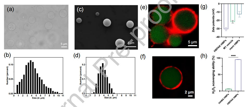 图1.(a)湿HBPAK HMPs的光学显微镜图像和(b)尺寸分布。(c)干燥HBPAK HMPs的SEM图像和(d)尺寸分布。(e-f)mem HMPs的CLSM图像。HBPAK HMPs用FITC标记,细胞膜囊泡用DiI染色。(g)M1囊泡和HMPs的Zeta电位。(h)HBPAK HMPs和HAMA HMPs各自的H2O2清除能力。***p<0.001。