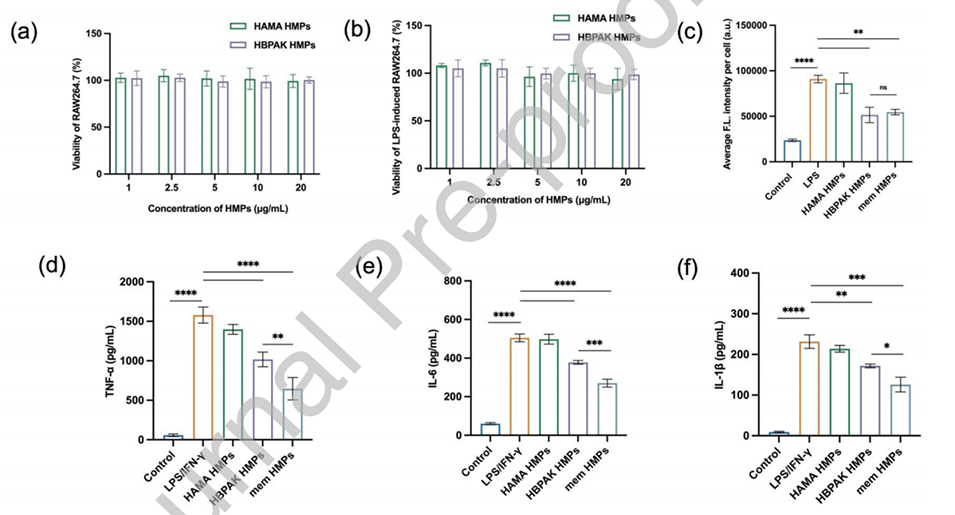 图2.与不同浓度HMPs孵育24小时后,(a)RAW264.7细胞和(b)LPS诱导的RAW264.7细胞的相对存活率。(c)不同处理的RAW264.7细胞内ROS的平均荧光强度。(d)RAW264.7细胞在LPS激活并用PBS、HAMA HMPs、HBPAK HMPs或mem HMPs处理后分泌的TNF-α、(e)IL-6和(f)IL-1β。*p<0.05、**p<0.01、***p<0.001和****p<0.0001。