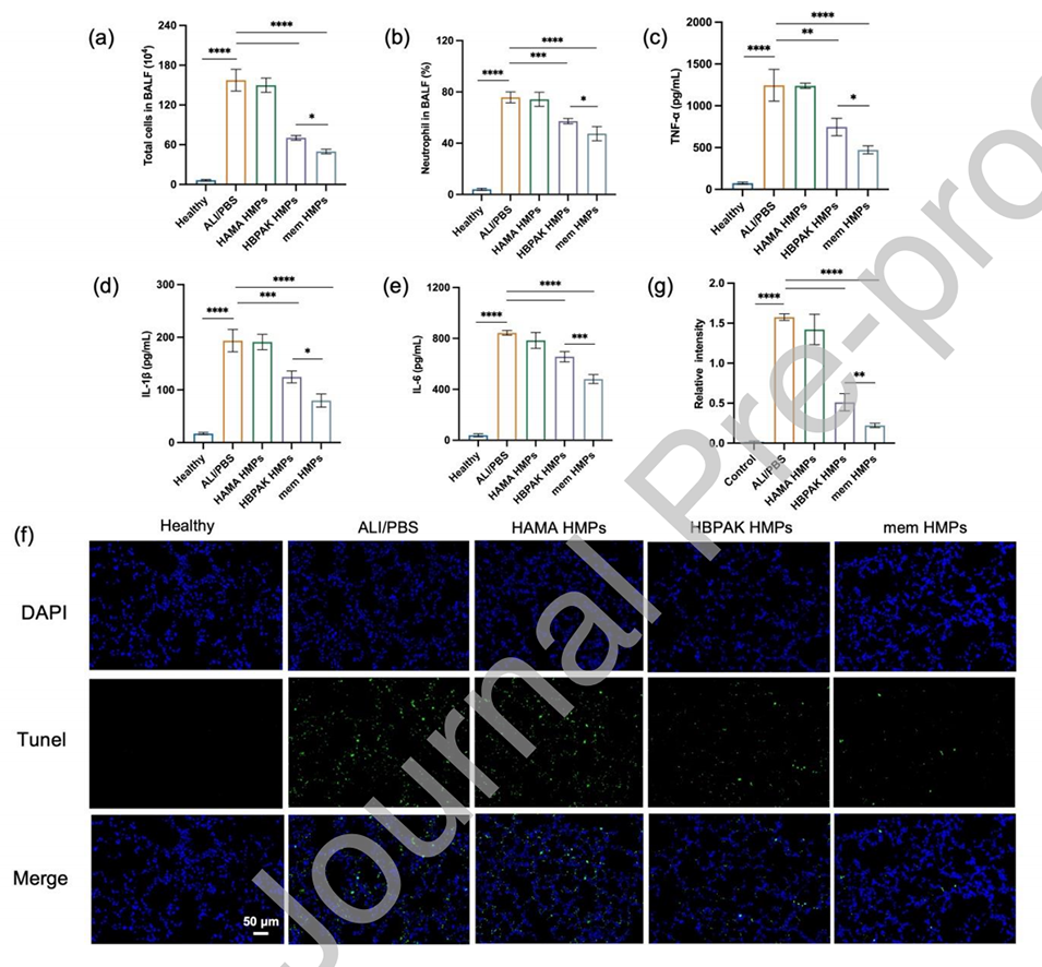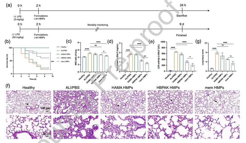 4、在ALI小鼠模型中,通过吸入给药,mem HMPs显著减少了中性粒细胞浸润和组织氧化损伤,从而缓解了肺部炎症。