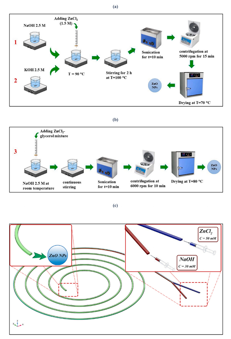 图1.合成方法示意图。a-b)三种批量方法,c)微流体方法。