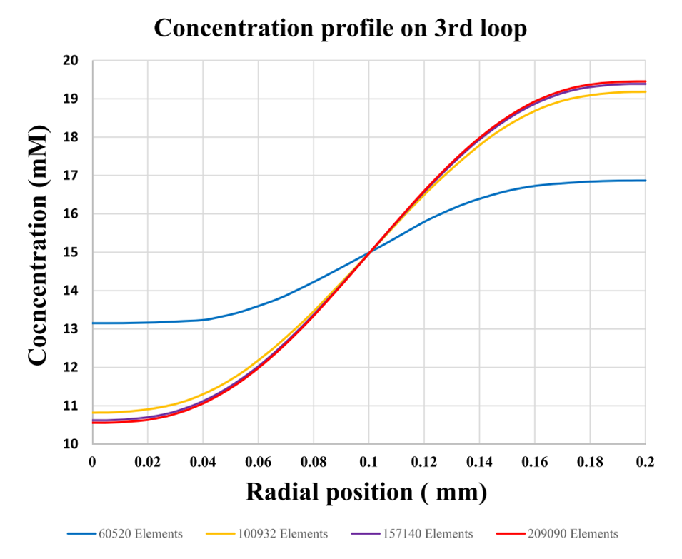 2、在微制造之前,根据CFD的浓度分布结果,通过混合指数计算确定微流体反应器中螺旋环的最佳数量和流速。