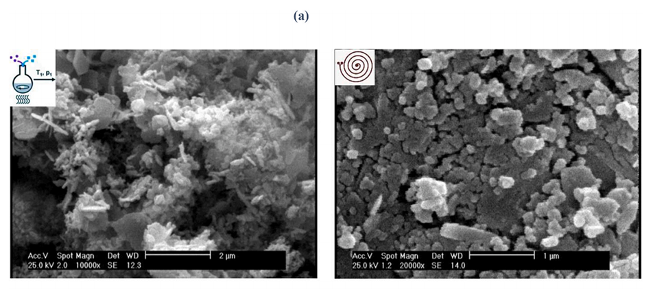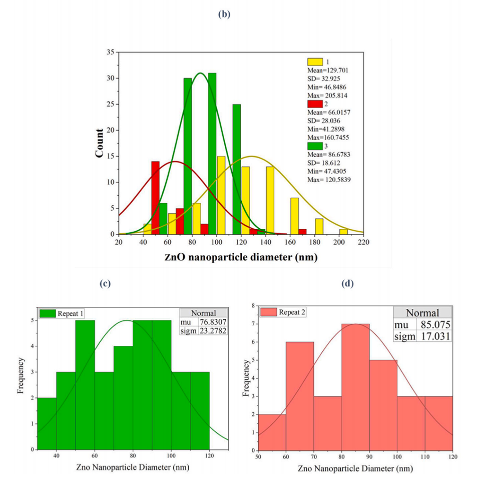 图8.a)批量和微流体合成的ZnO的SEM图像,b)在微流体反应器中不同流速下ZnO的尺寸分布,c)案例3的重复1和d)重复2。