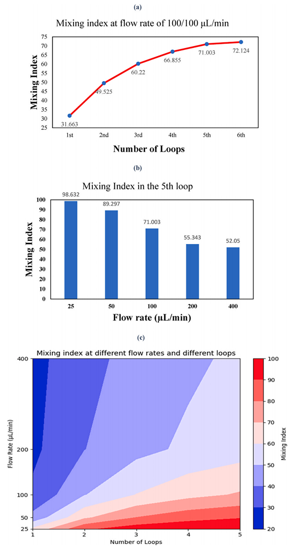 图4.a)在100/100μL/min的流速下,环路数量对混合指数的影响,b)第五环路微混合器的流速影响,c)流速和环路数量的共同影响。