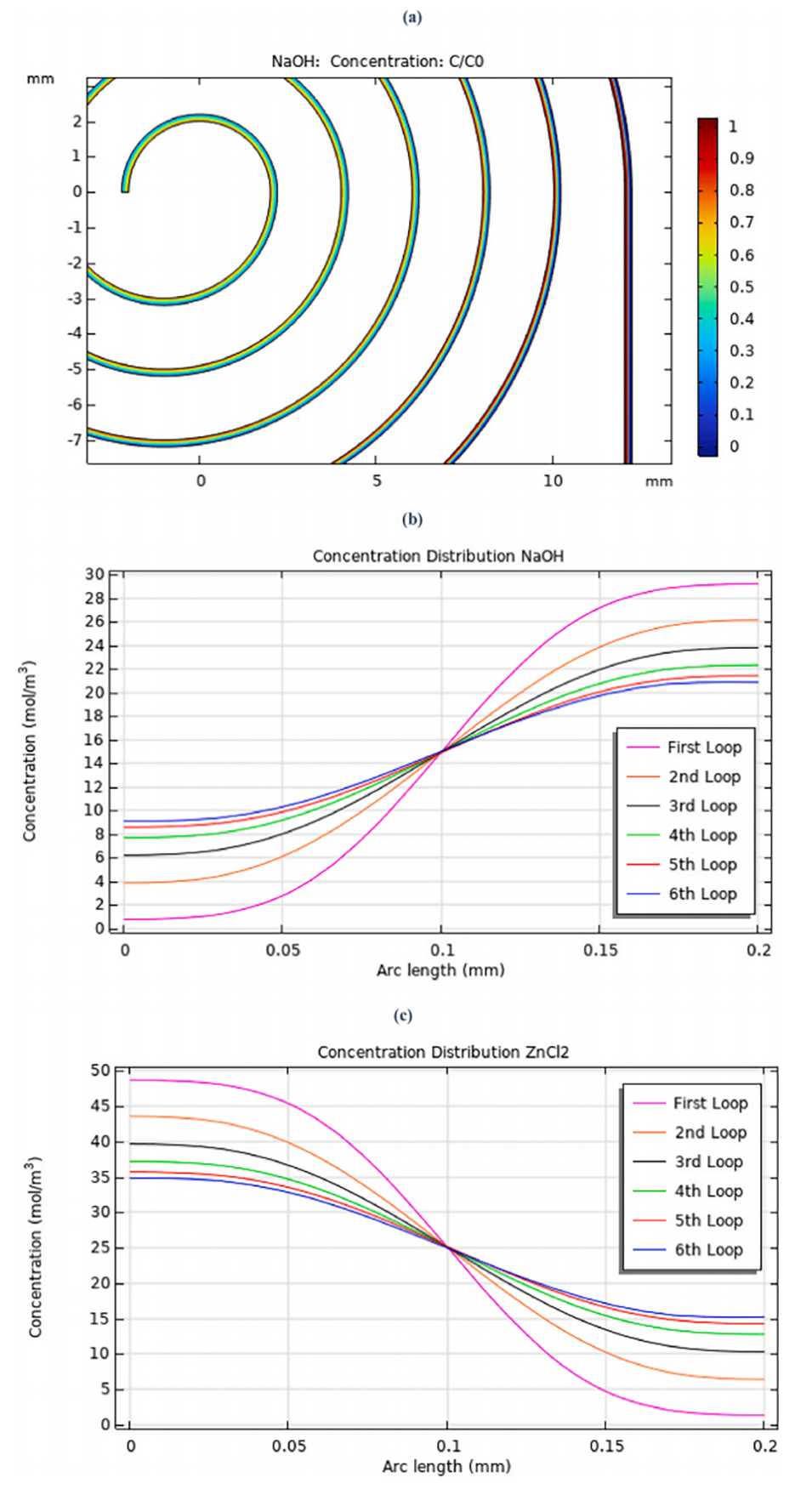 图5.a)流速为100/100μL/min时的NaOH浓度曲线,以及环路数量对b)NaOH和c)Zncl2浓度曲线的影响。