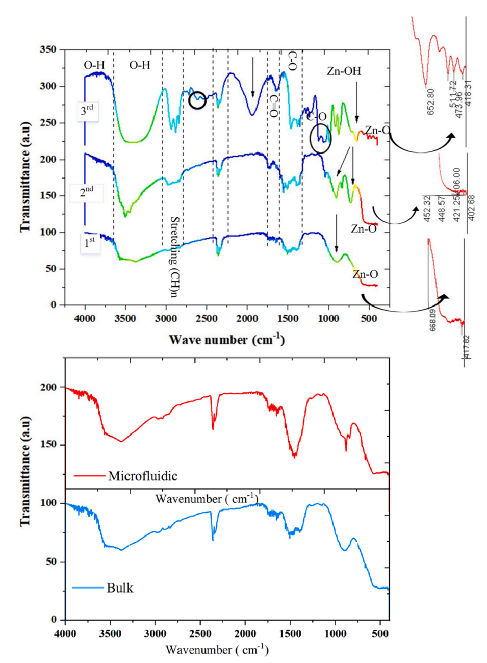图6.三种批量方法和微流控法合成ZnO的FTIR分析。