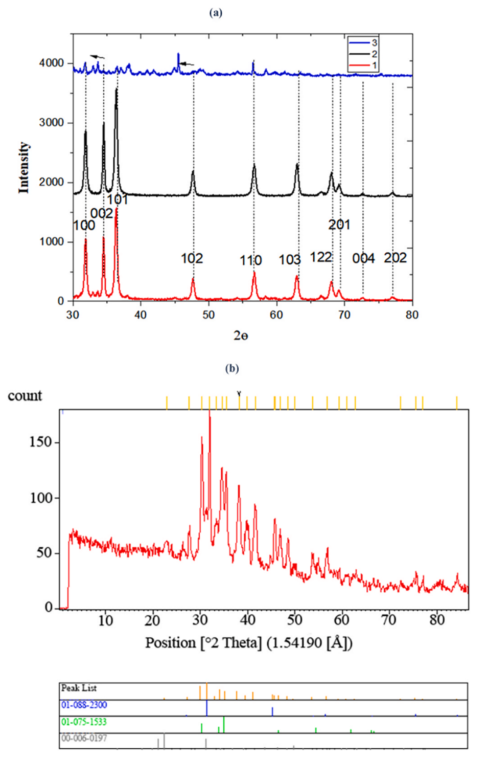 图7.用a)批量法和b)螺旋微流控反应器合成的ZnO的XRD光谱。