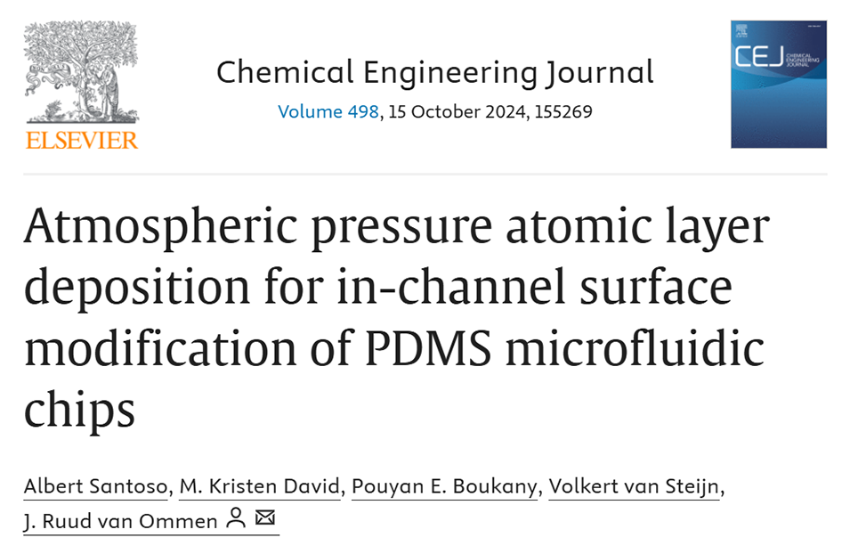 近期,有研究人员提出了一种简单、新颖的策略,利用大气压原子层沉积(AP-ALD)技术在键合PDMS微流控通道内壁沉积金属氧化物纳米层,以提高其对有机溶剂的抗性和表面功能化能力,从而拓宽PDMS设备的应用范围。相关研究以“Atmospheric pressure atomic layer deposition for in-channel surface modification of PDMS microfluidic chips”为题目,发表在期刊《Chemical Engineering Journal》上。
